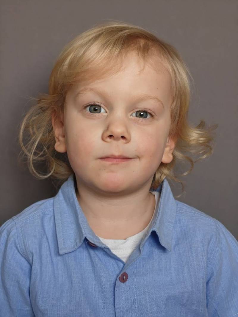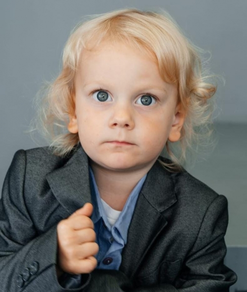 Не боится камеры, съёмочной группы, идёт на ручки к актёрам. Спокойный малыш. Любит музыку, танцевать.