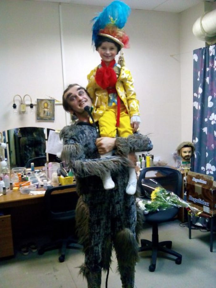 Фото в гримёрной после спектакля.Актёр в роли Чёрта и Таисия в роли Пажа.